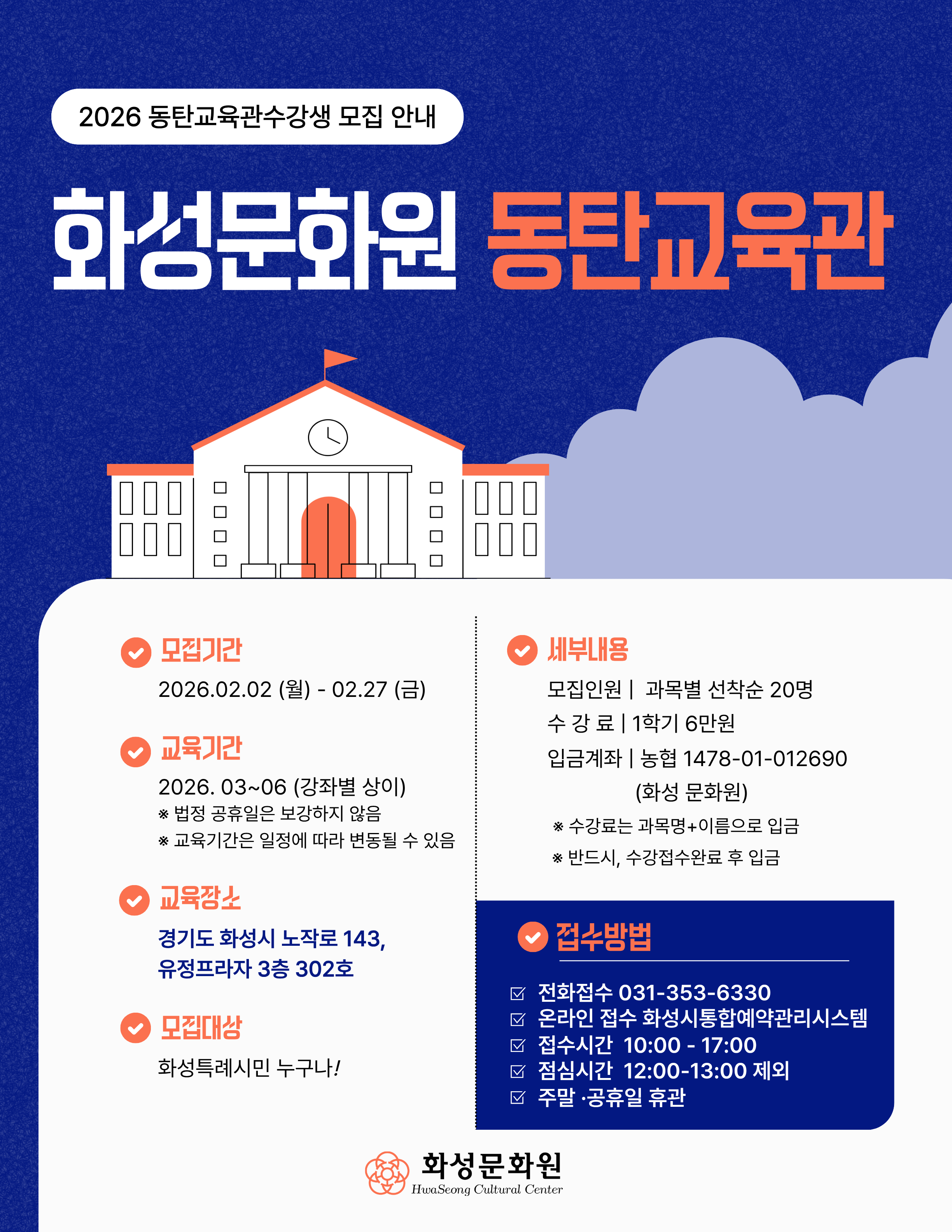 📍접수방법 : 전화 접수) ☎화성문화원 031-353-6330 / ☎동탄교육관 070-4044-8340