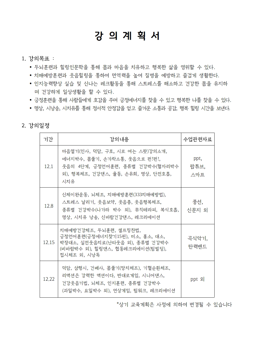 [특강] 함께 웃GO! 함께 젊GO! 치매예방 체조 강의계획서