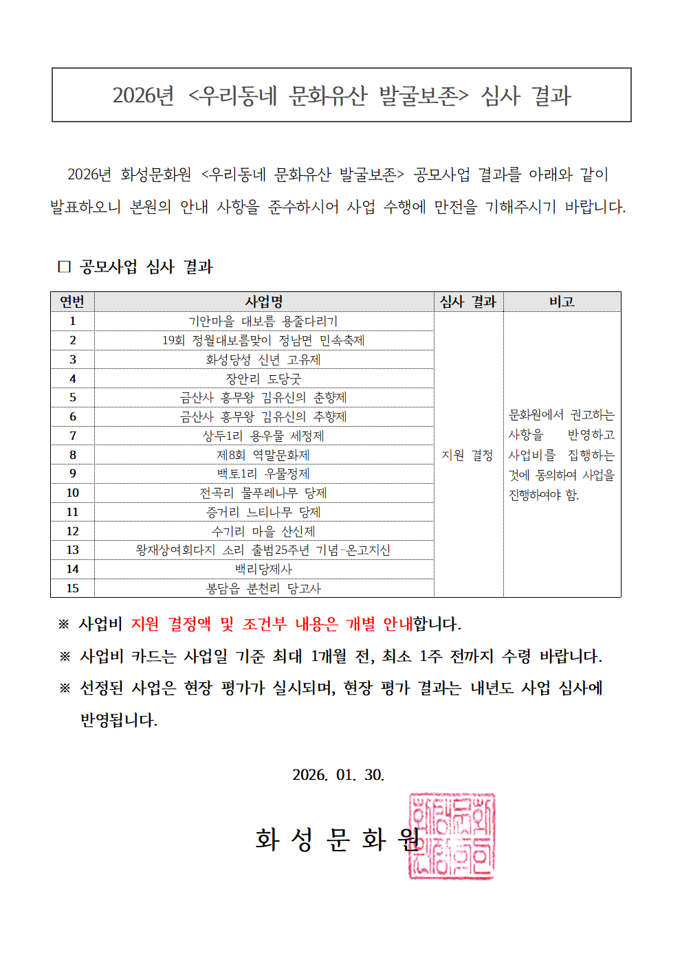 「2026년 우리동네 문화유산 발굴보존 사업」 서류심사 결과,종합 심사 기준에 따라 최종 선정 사업을 확정하였음을 안내드립니다.